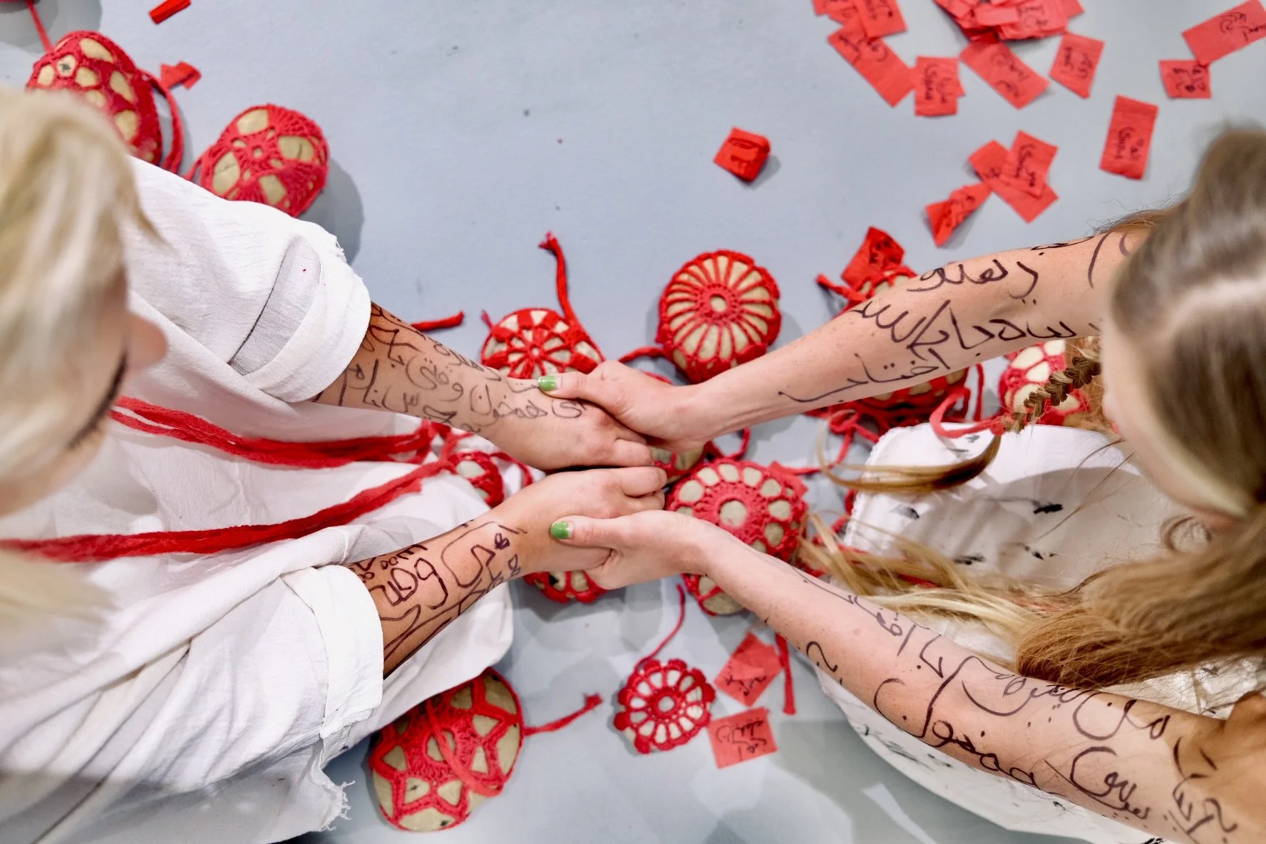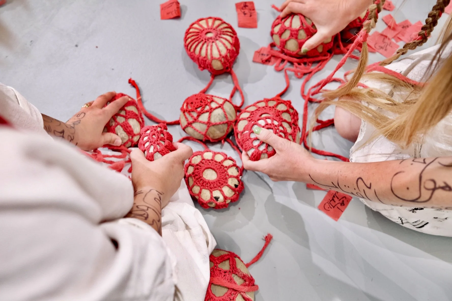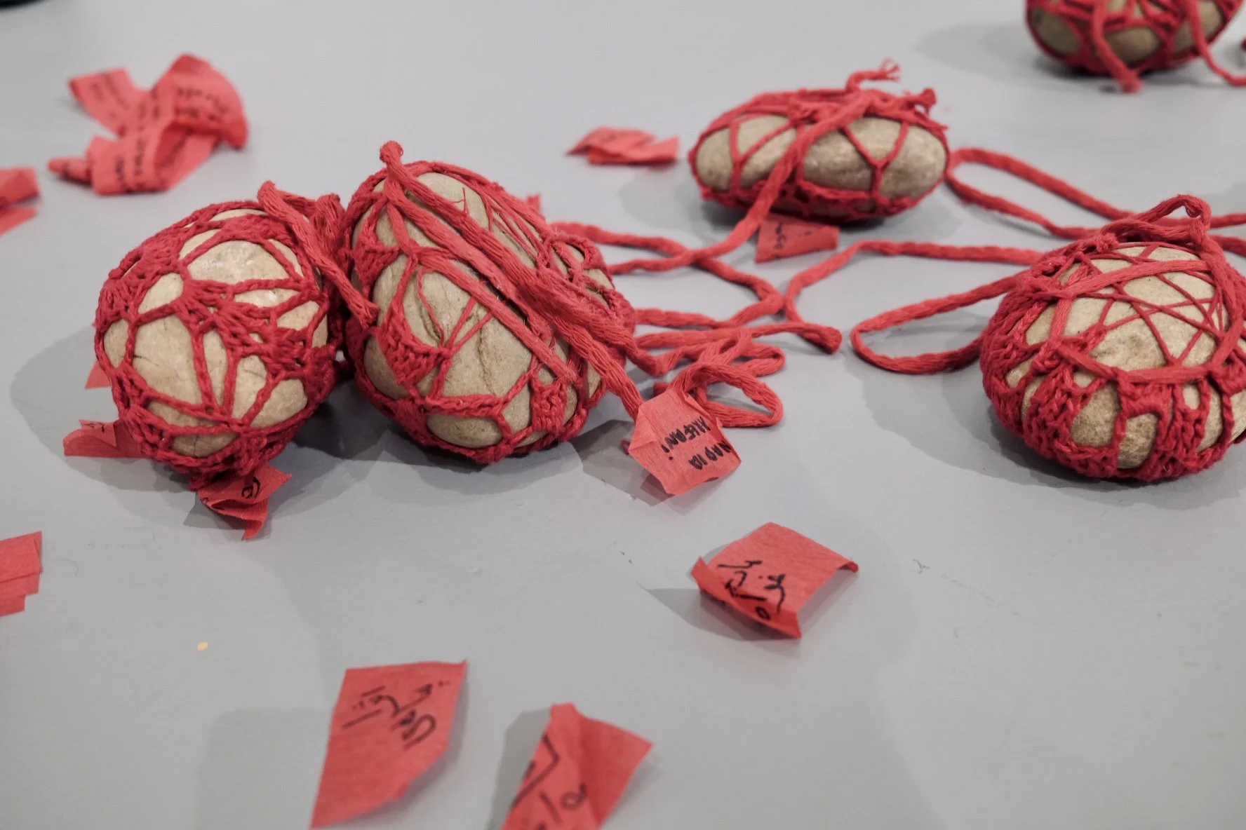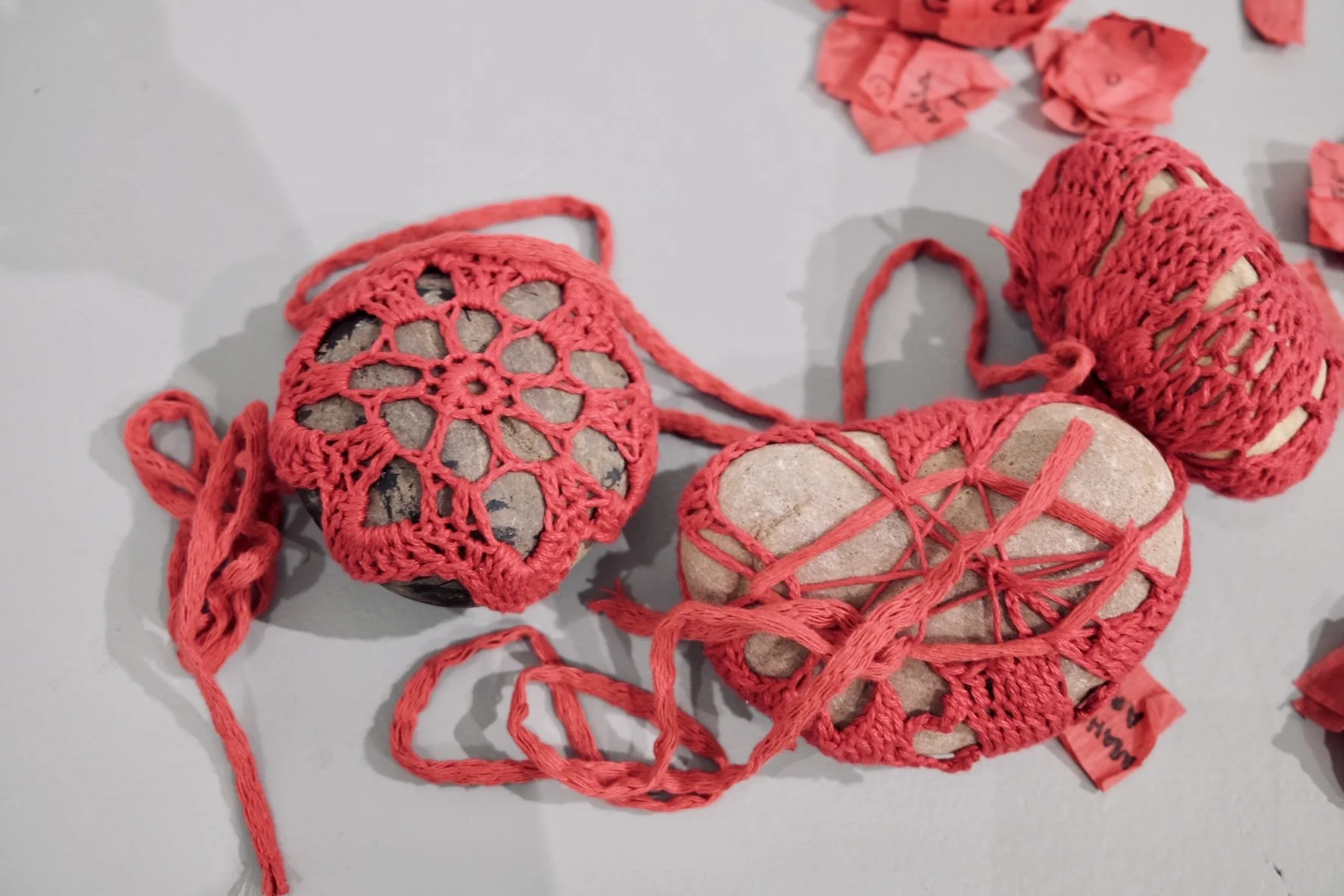 By inscribing the names of women and girls killed during the Iranian protests, the performance memorialized their bravery while evoking hope, unity, and action. The stones used in the piece symbolized the burdens imposed by misogynistic religious laws, while the crocheted elements—a traditionally feminine craft—served to challenge and soften these constraints. The red yarn signified the lasting impact of violence on women’s bodies, offering a poignant reminder of the struggle for equality and standing as a powerful gesture of solidarity with the Woman, Life, Freedom movement.