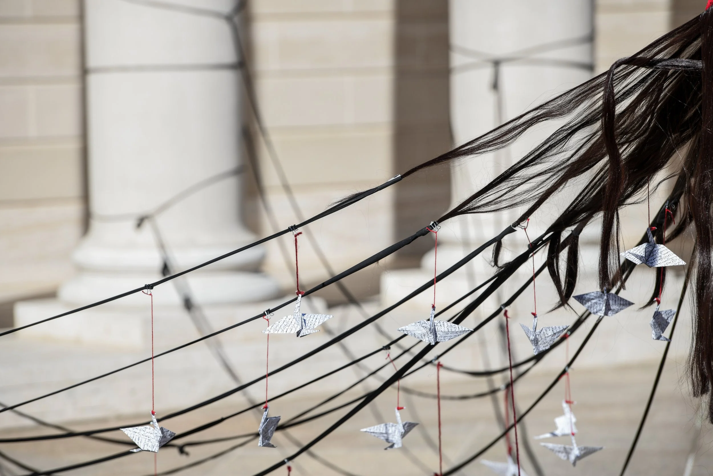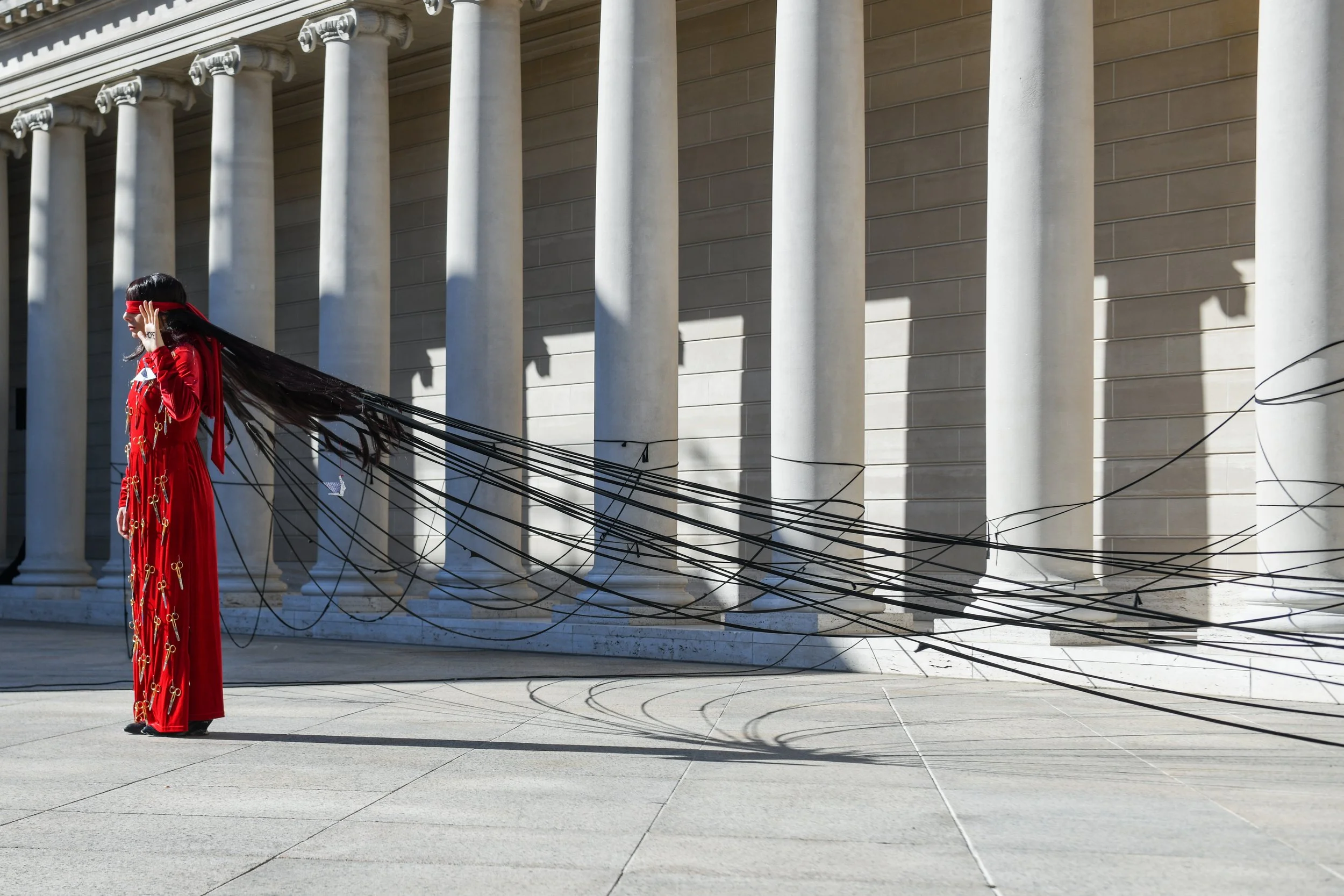 Chopped hair and discarded hijabs became global symbols of women’s liberation following the death of 22-year-old Mahsa Amini. At Clarion Alley, Mobina Nouri performed a piece in which she wore a red dress with scissors attached and stood with long strands of her hair tied to a gate, each strand displaying the photo and name of an imprisoned protester. She invited participants to cut her hair and take the images as somber reminders of these individuals’ fates. Two musicians performed a duet titled “Voices of Iran.”
